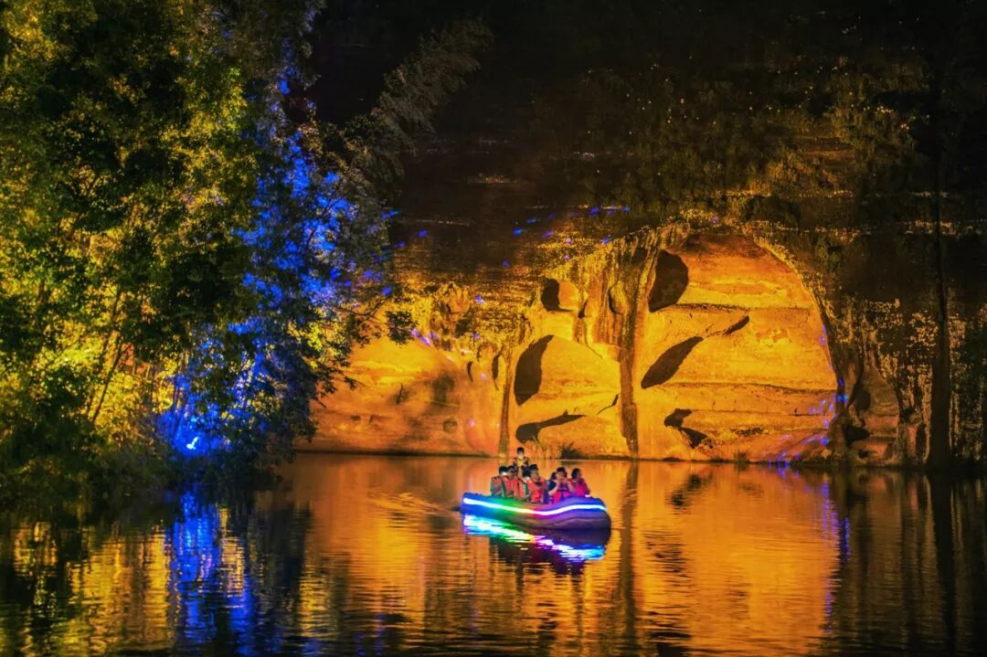 随舟潜入夜,探寻状元梦。全静音的发光气垫船,载着追梦的游人,夜行山水间,听蛙唱蝉奏,观月下仙境。