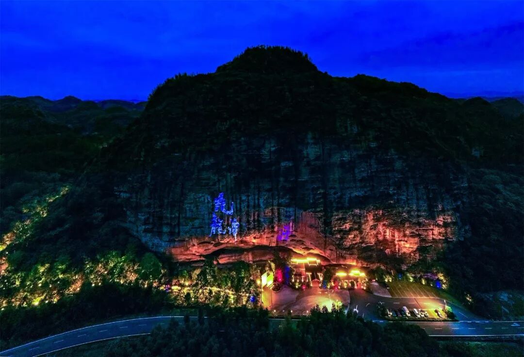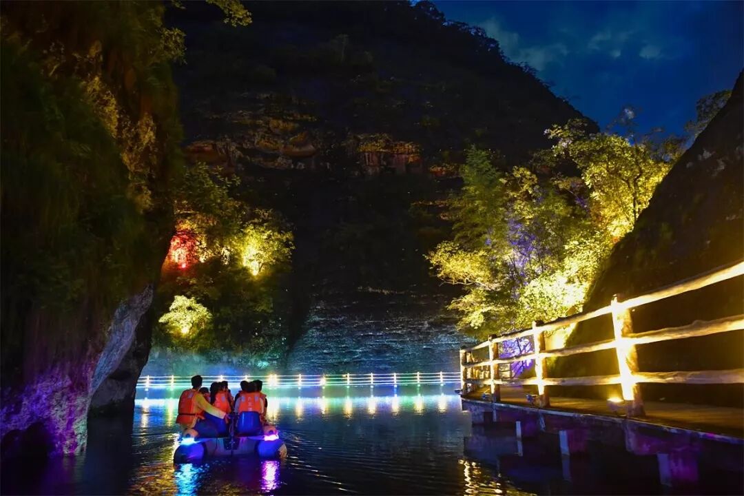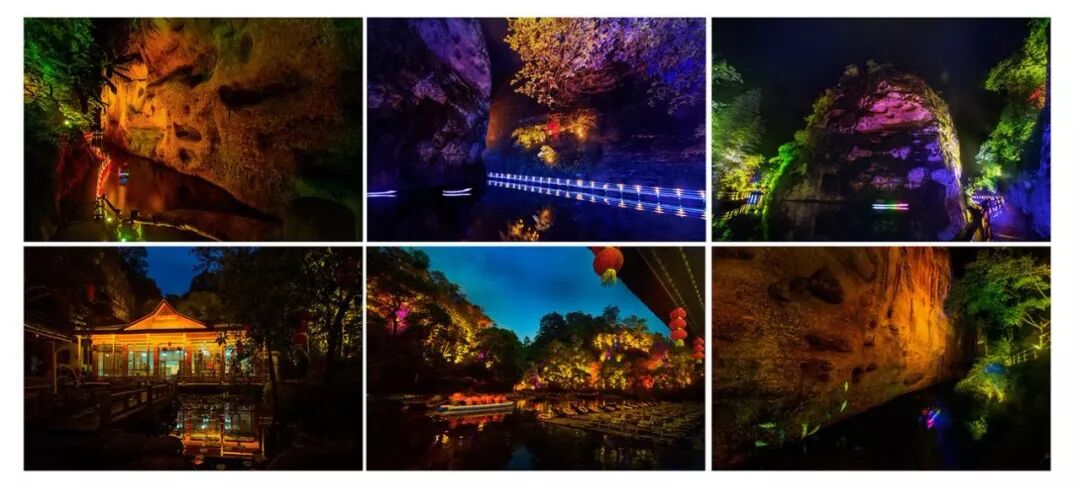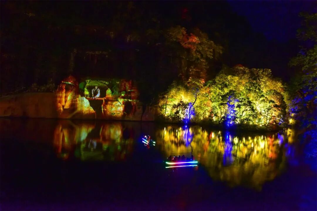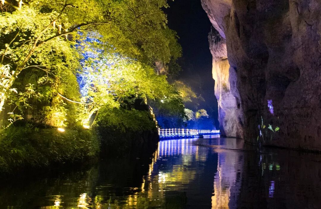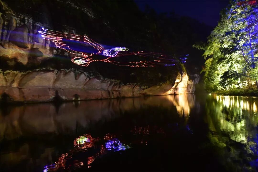 夜的九龙潭,崖壁、丛林、峡谷、湖面、石桥、隧洞,披上了斑斓的艺术灯光外衣。
